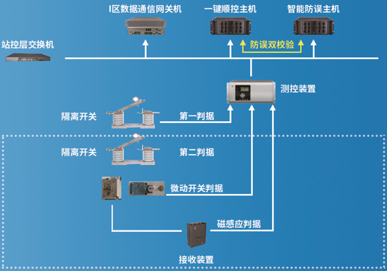 一键顺控操作由一键顺控主机、智能防误主机、测控装置、数据通信网关机及一次设备双确认装置等协同完成,操作人员调用一键顺控主机预制的操作票,经智能防误主机和一键顺控主机防误双校核后,由一键顺控主机将操作指令下发至现场设备完成各项操作任务,磁感应传感器/微动开关进行隔离开关设备分合闸位置判断,构成隔离开关分合闸位置的“双确认”判据,实现变电站端一键顺控操作。