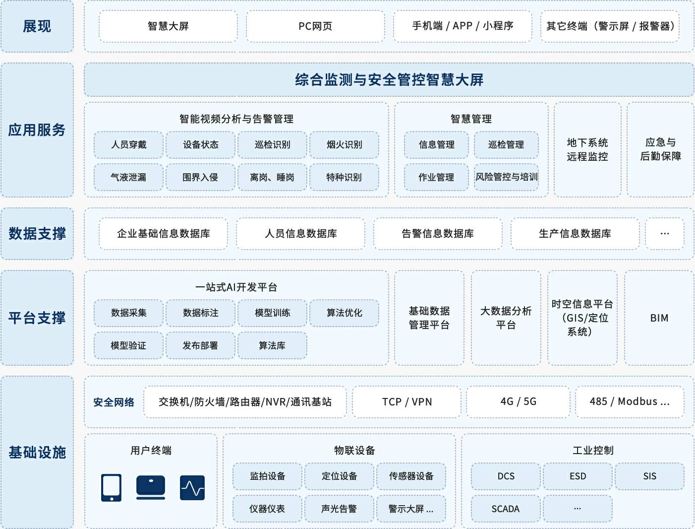针对矿山安全生产的管理要求,紧抓需求痛点,开云官方手机入口官网-开云(中国)创新提出“一基础、双支撑、多平台、N应用”的智慧矿山方案,实现不同阶段需求逐步实现未来智慧矿山。开云官方手机入口官网-开云(中国)创新充分利用人工智能算法优势,从智能视频分析风险隐患切入,实现风险隐患全生命周期分析与管理,同时应用智慧化作业流程、智慧检维修提升作业生产效率,应急与后勤保障是重中之重,除了实现地下通风系统、定位系统、电力系统、通讯系统、排水系统以及环境监测系统的全天候监控之外,应急物资管理系统保障物资及时可用,人员设备定位系统保障下井人员位置的实时管控,充分实现应急后勤保障,开云官方手机入口官网-开云(中国)创新智慧矿山方案永远将安全生产放在第一位。